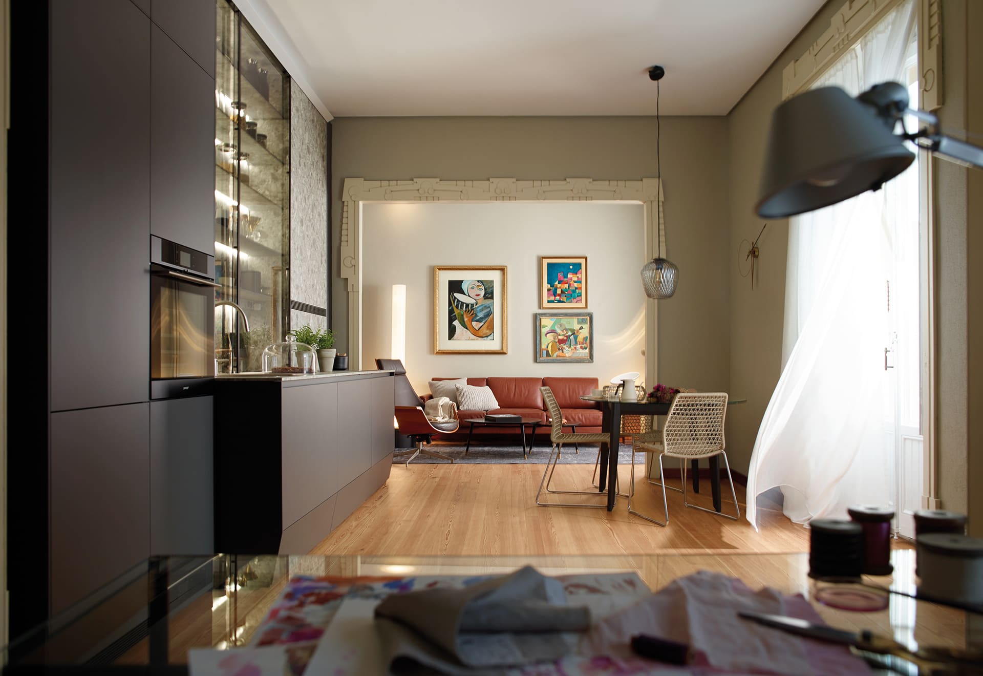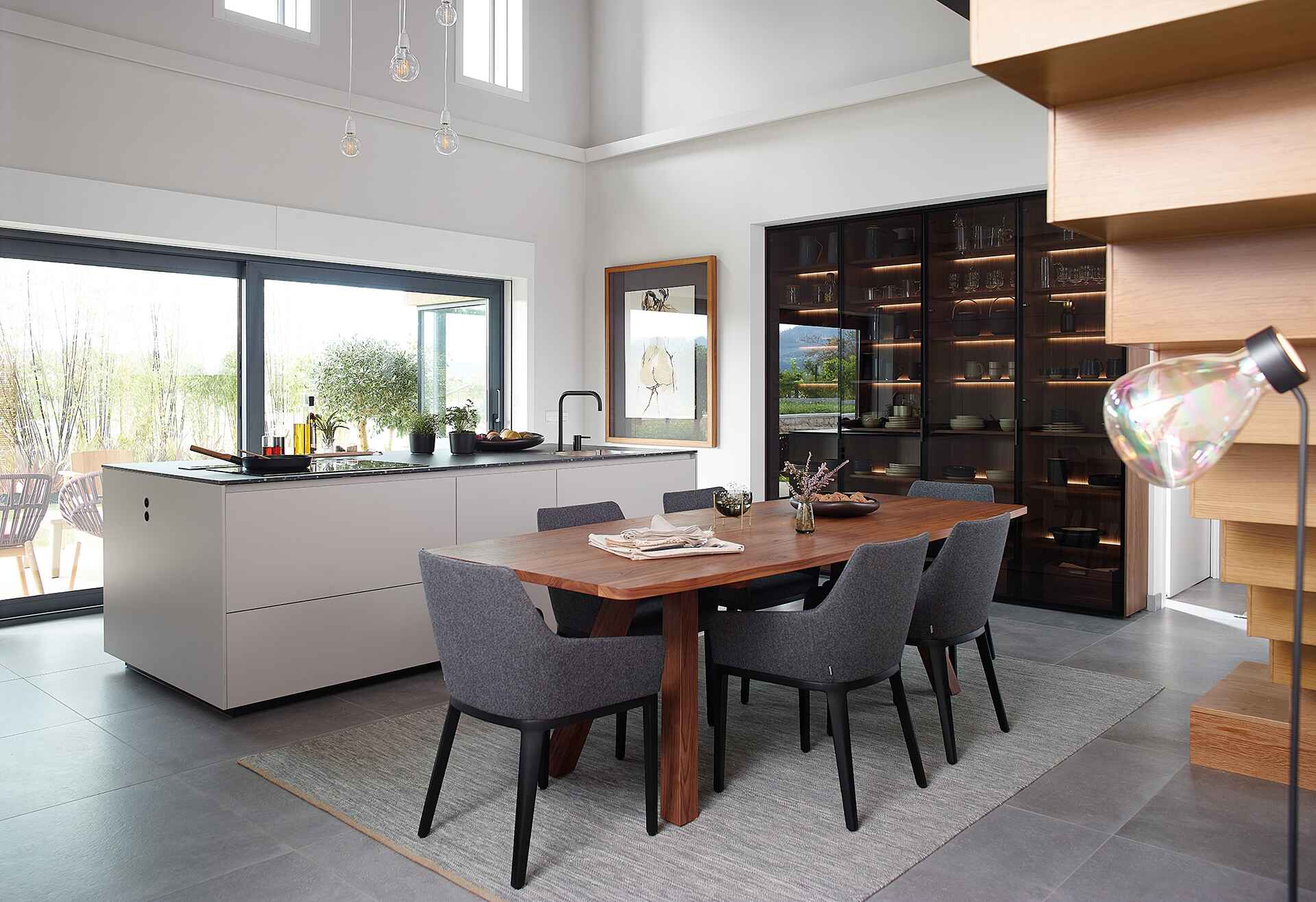 Cocina lineal con gran vitrina, estudio y salón