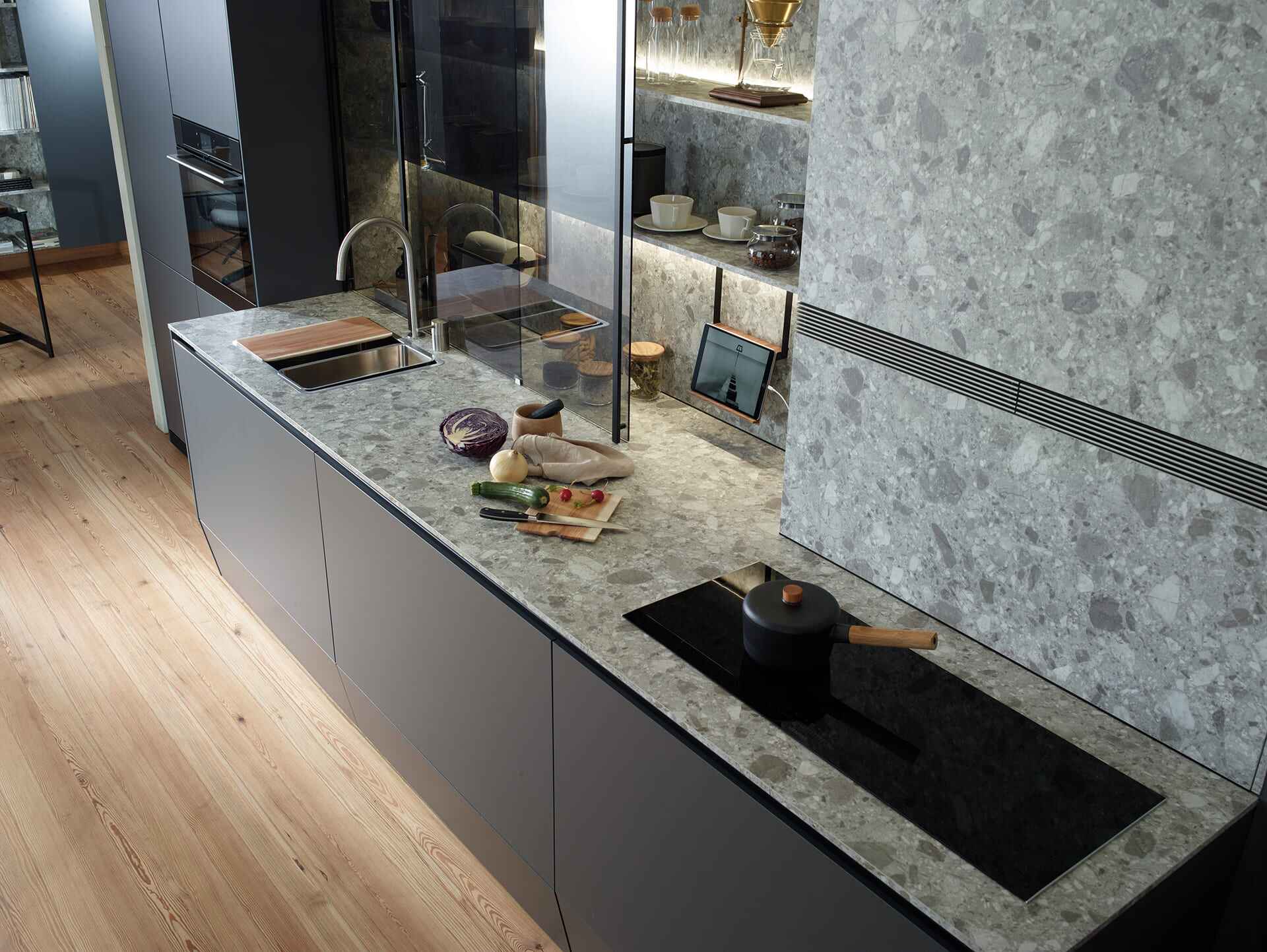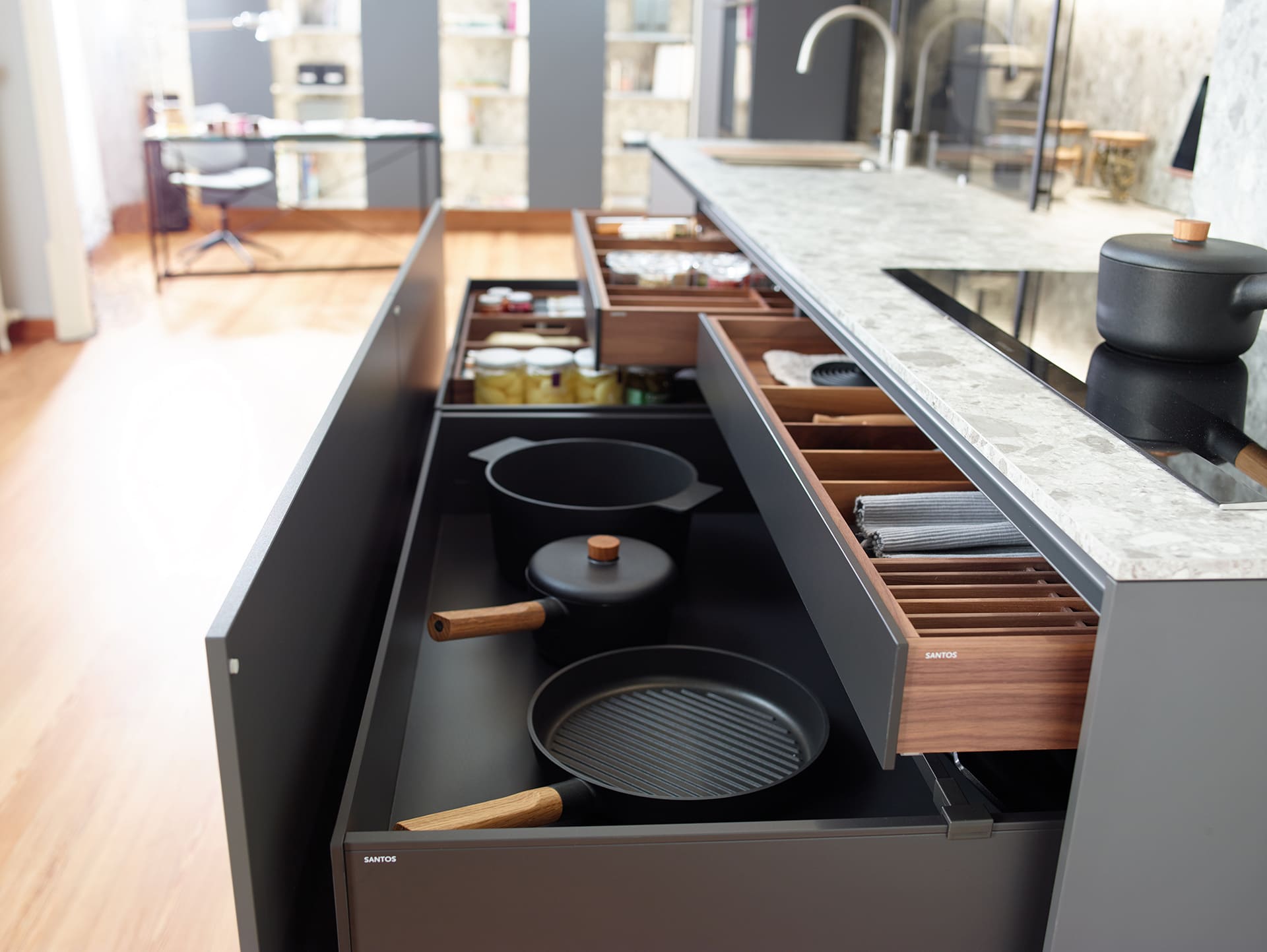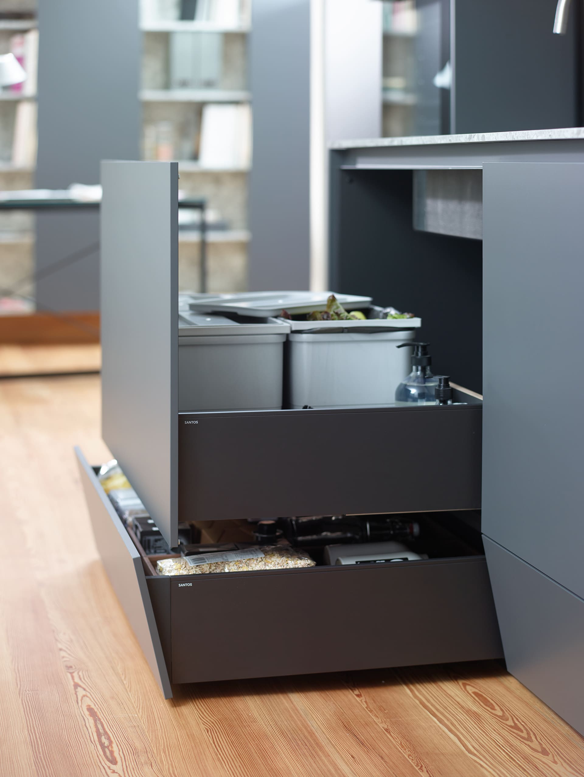 En el ámbito de la altura, desafiamos las restricciones mediante un ingenioso cajón zócalo, comparable a un gavetero. Esta solución brinda hasta cuatro niveles de almacenamiento en cada módulo, ofreciendo el mejor acceso posible. La altura y profundidad aprovechables bajo la encimera se convierten en un volumen altamente accesible. Incluso bajo el módulo portafregadero, dispones de una gaveta con suficiente altura —a partir de veinticuatro centímetros— para organizar ollas y paquetes de alimentos.