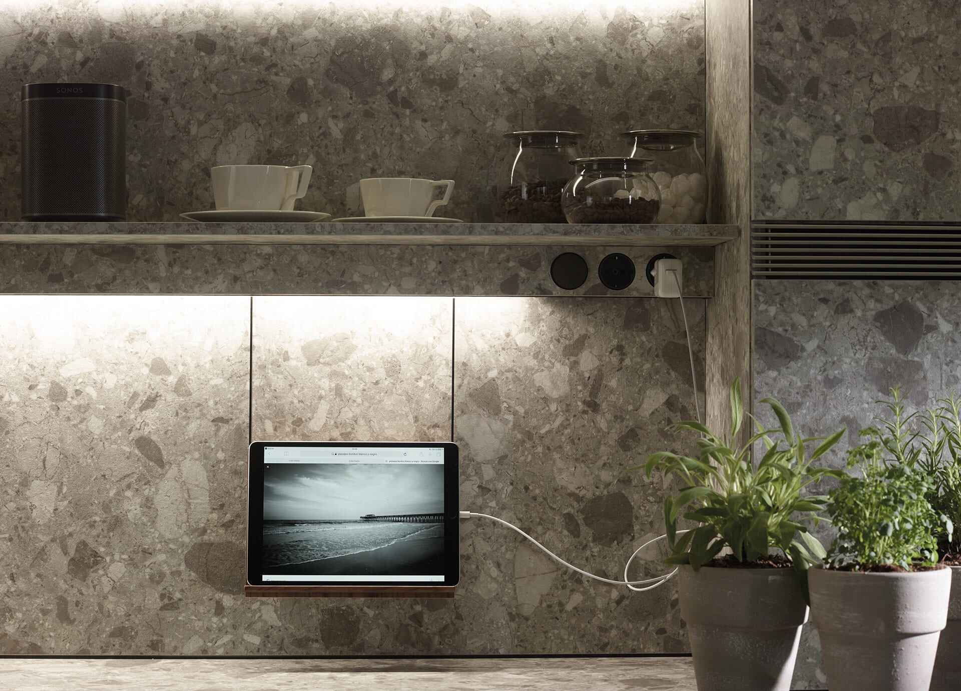 La pared vertical junto a la encimera se transforma en un recurso multifuncional, albergando elementos como portarrollos, especiero, recipiente para cubiertos de madera, hierbas aromáticas, portacuchillos, entre otros. Todo a la vista y al alcance de la mano.