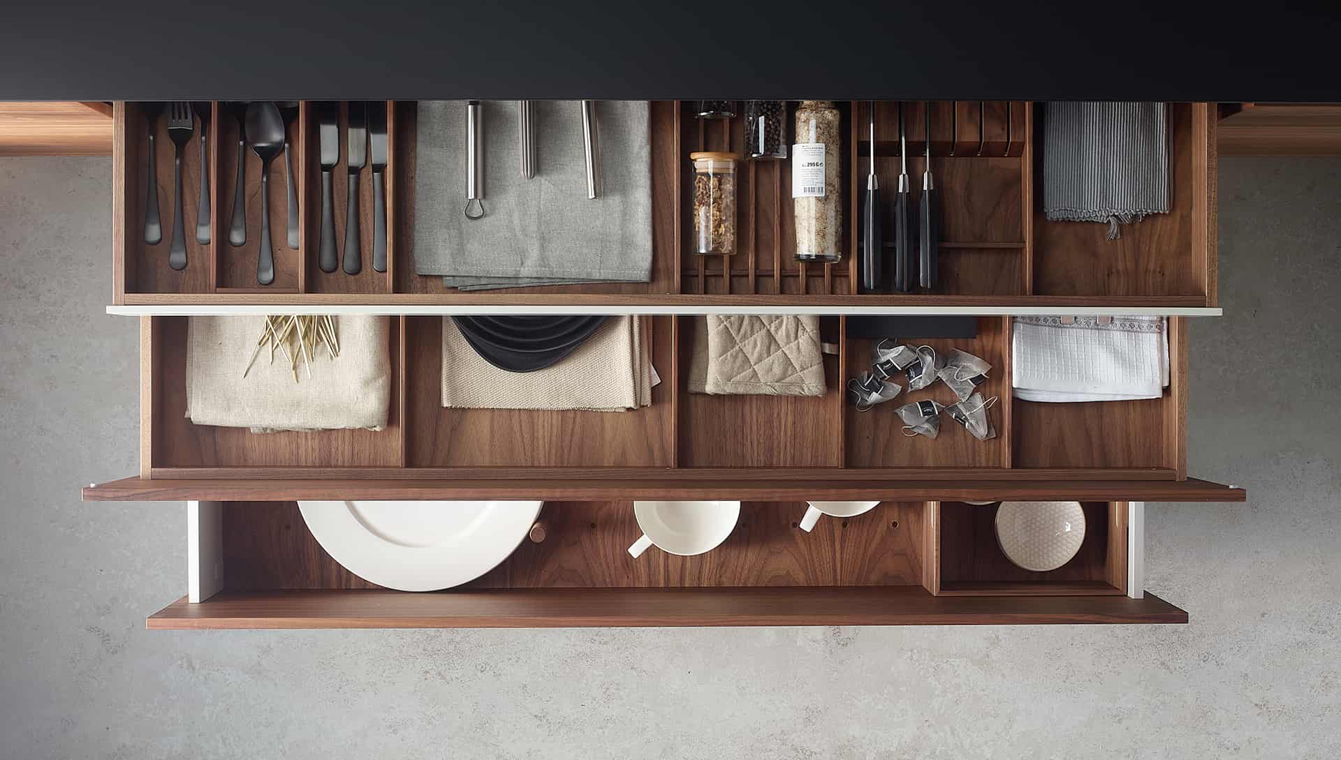 En cuanto a la optimización del espacio, la versatilidad es clave. Los cajones cubertero ofrecen una base modular donde se integran diversas utilidades: separaciones para cubiertos, portacuchillos, portaespecies, bandejas para cortar el pan, tablas de corte y espacio para hasta tres bandejas de servicio. La lista se extiende a un portarrollos para papel aluminio, film plástico y papel de horno, infusiones, cápsulas de café, manteles, paños y diversos utensilios de cocina.