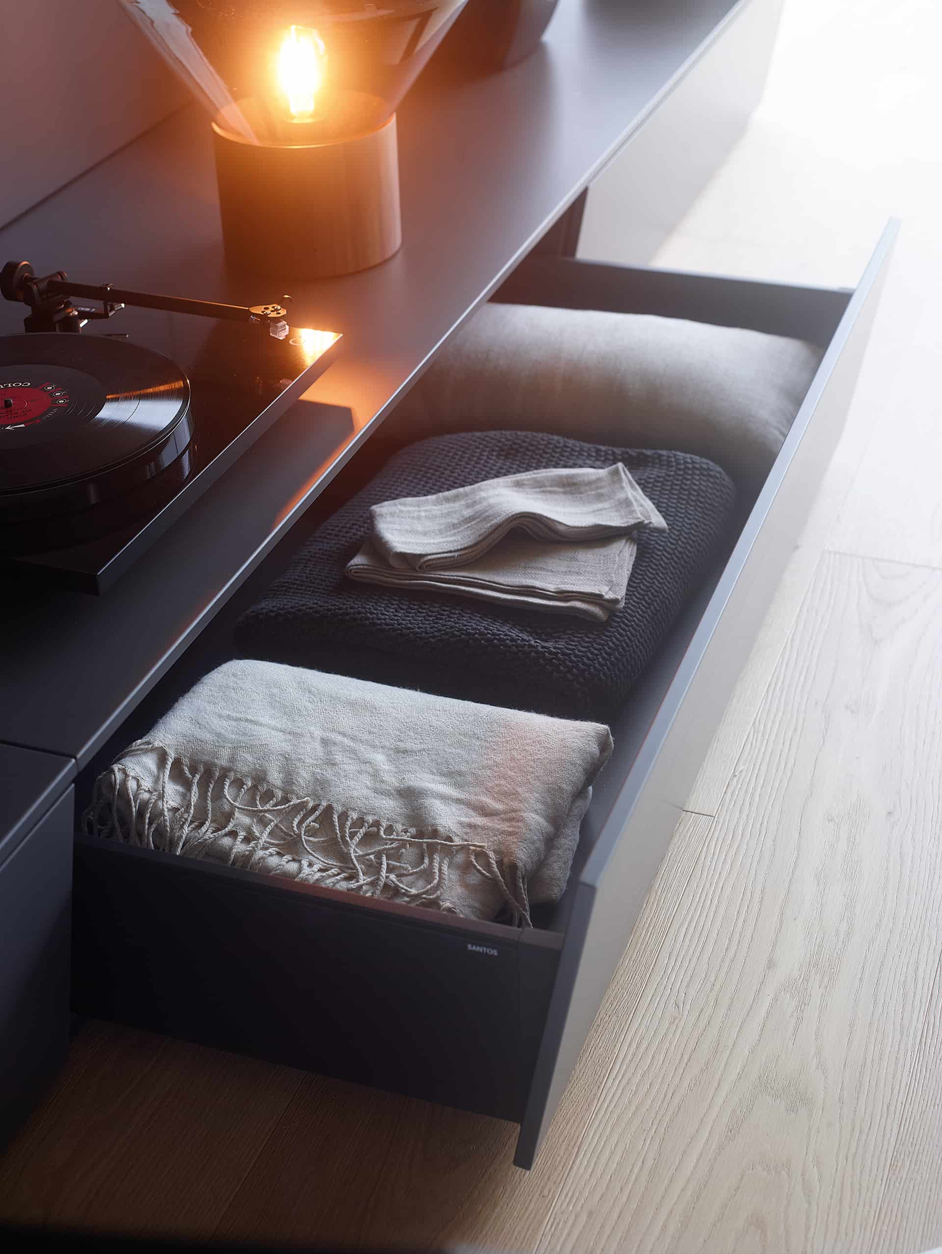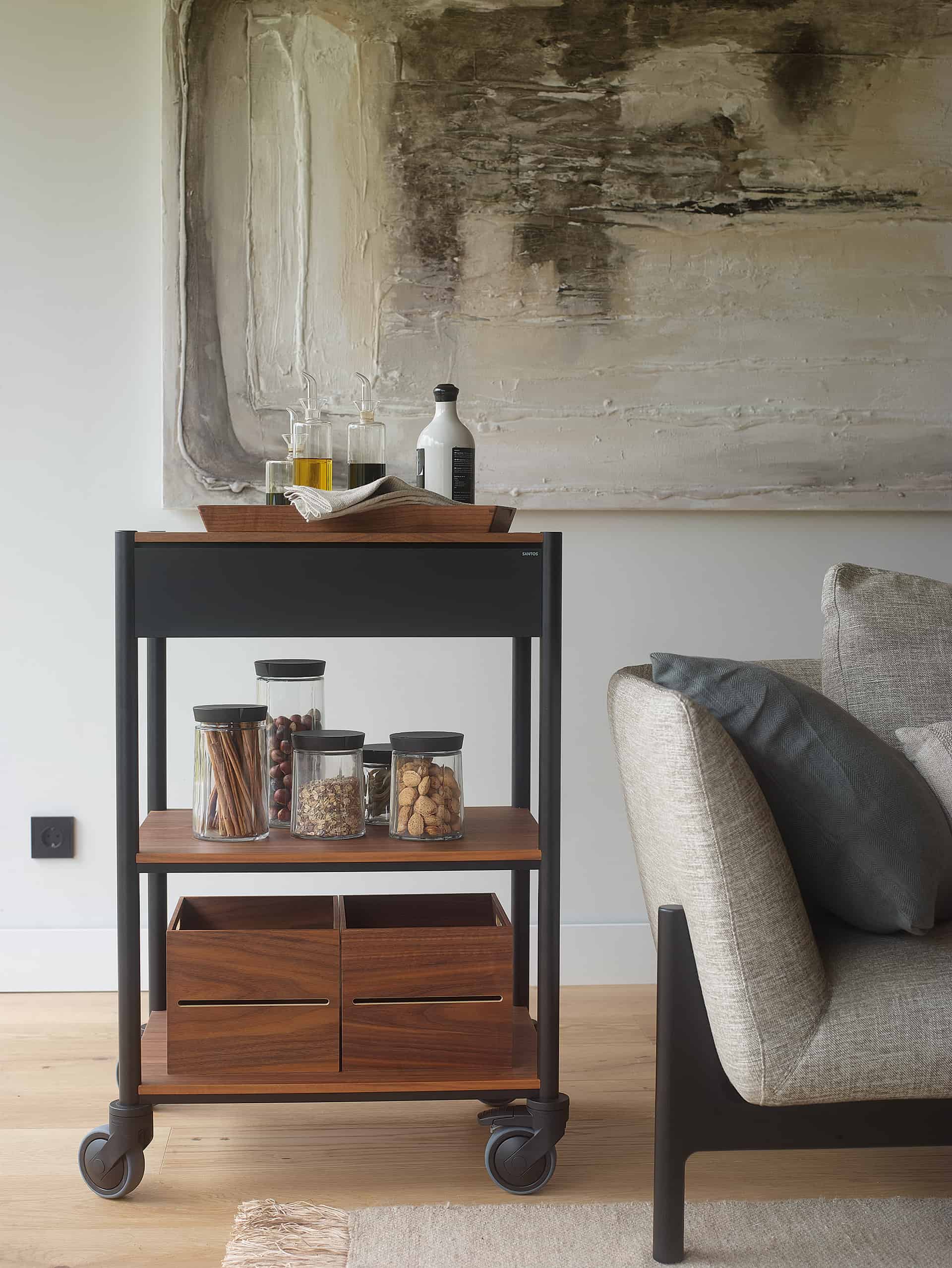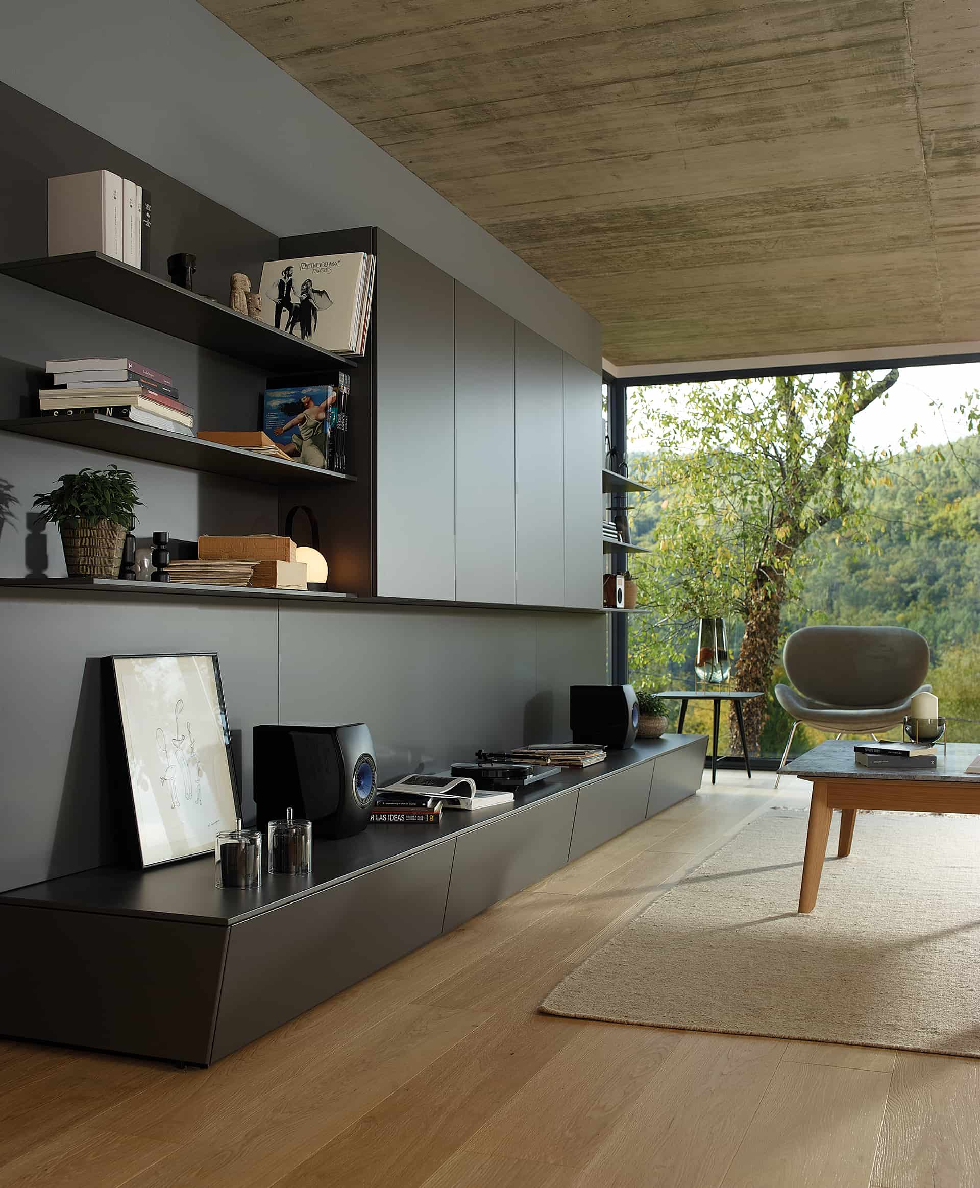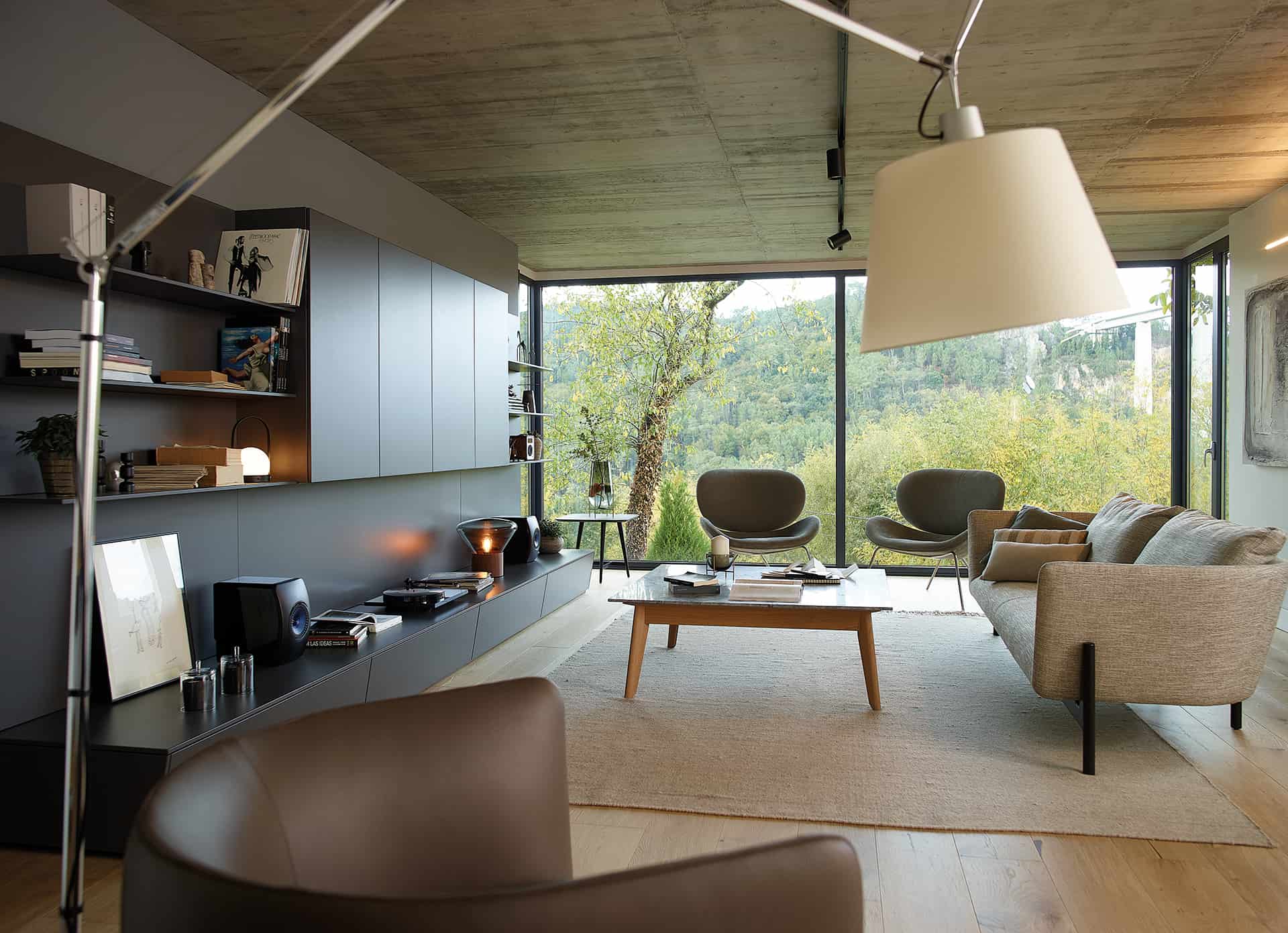 La versátil línea Living de Santos presenta módulos combinables que permiten la creación de muebles de salón, vitrinas, aparadores, estanterías y paneles con baldas. Su diseño modular ofrece la flexibilidad de amueblar diversas áreas, como salas de estar, comedores, estudios, recibidores y pasillos, adaptándose con facilidad a cualquier espacio, preferencia o necesidad. La uniformidad en los acabados de todos los muebles contribuye a consolidar la sensación de continuidad entre ambientes. Asimismo, la opción de instalarlos de forma suspendida otorga ligereza visual, y la posibilidad de añadir sistemas de iluminación indirecta permite la creación de entornos cálidos y acogedores.