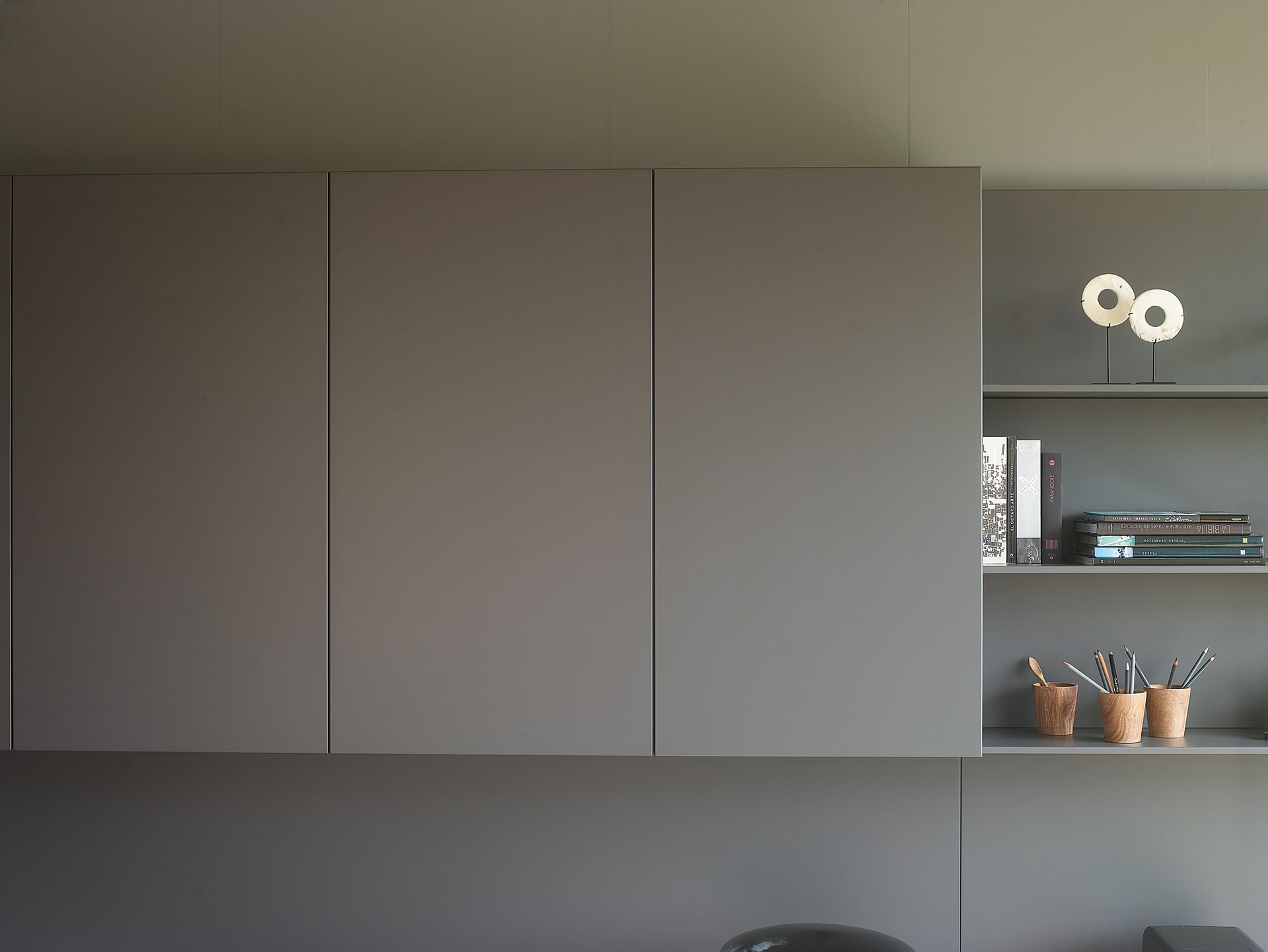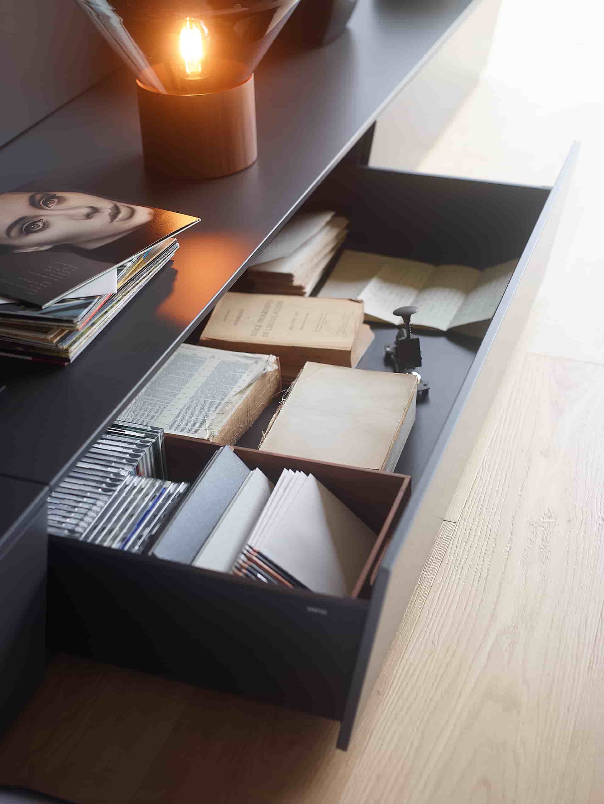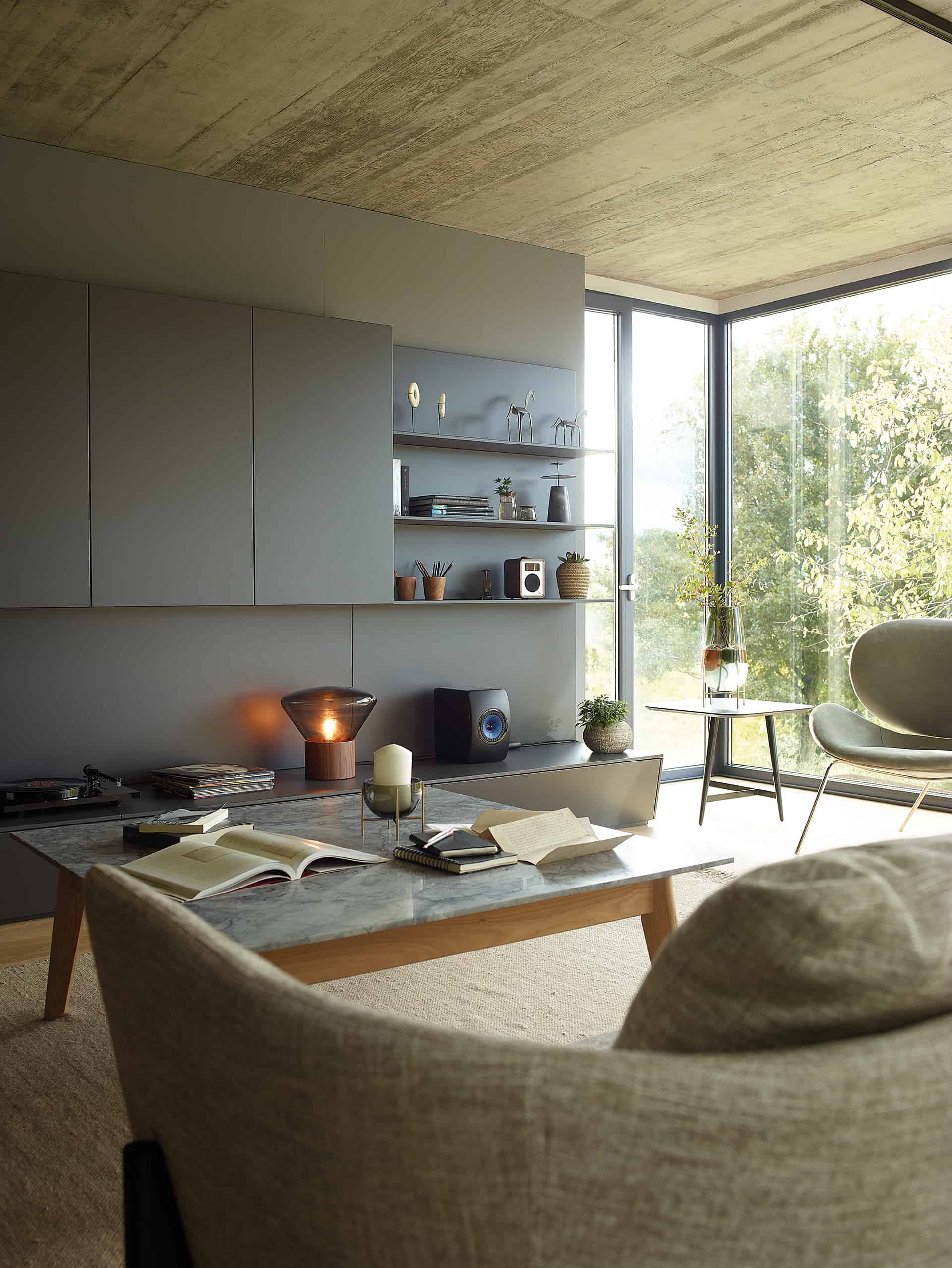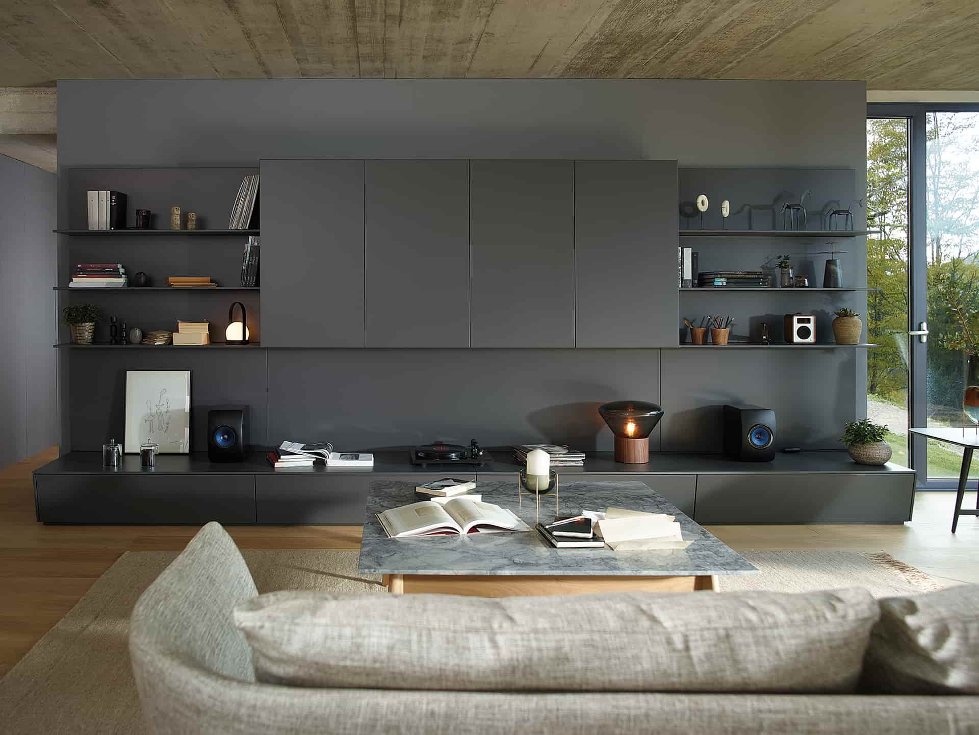 La versátil línea Living de Santos presenta módulos combinables que permiten la creación de muebles de salón, vitrinas, aparadores, estanterías y paneles con baldas. Su diseño modular ofrece la flexibilidad de amueblar diversas áreas, como salas de estar, comedores, estudios, recibidores y pasillos, adaptándose con facilidad a cualquier espacio, preferencia o necesidad. La uniformidad en los acabados de todos los muebles contribuye a consolidar la sensación de continuidad entre ambientes. Asimismo, la opción de instalarlos de forma suspendida otorga ligereza visual, y la posibilidad de añadir sistemas de iluminación indirecta permite la creación de entornos cálidos y acogedores.